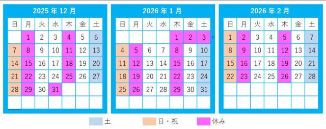 12月~2月営業日カレンダーです。