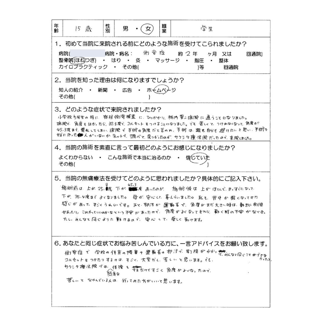 でも苦しくてつけられなくなって、角度が45.3度まで悪化してしまい、病院で「手術の角度」だと言われました。手術は親も自分も避けたいと思い、手術をせずに治った人がいないかネットで調べて見つけたのがサクシタ療法院でした。