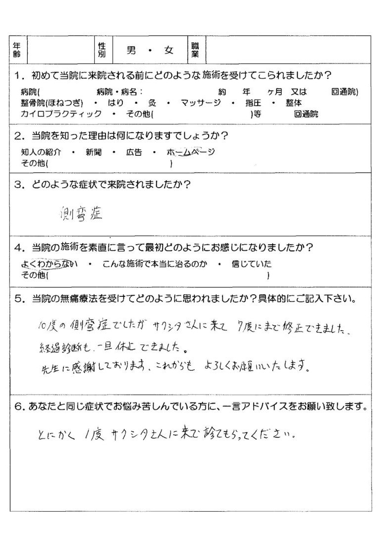- 側弯症4回程度の施術を受け角度が26°→17°21°→20°と改善。 先生にはとても感謝しています。